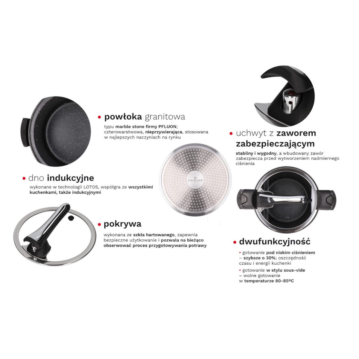- dwufunkcyjność – gotowanie pod niskim ciśnieniem – szybsze o 30 %; oszczędność czasu i energii kuchenki; gotowanie w stylu sous-vide – wolne gotowanie w temperaturze 80-85 oC