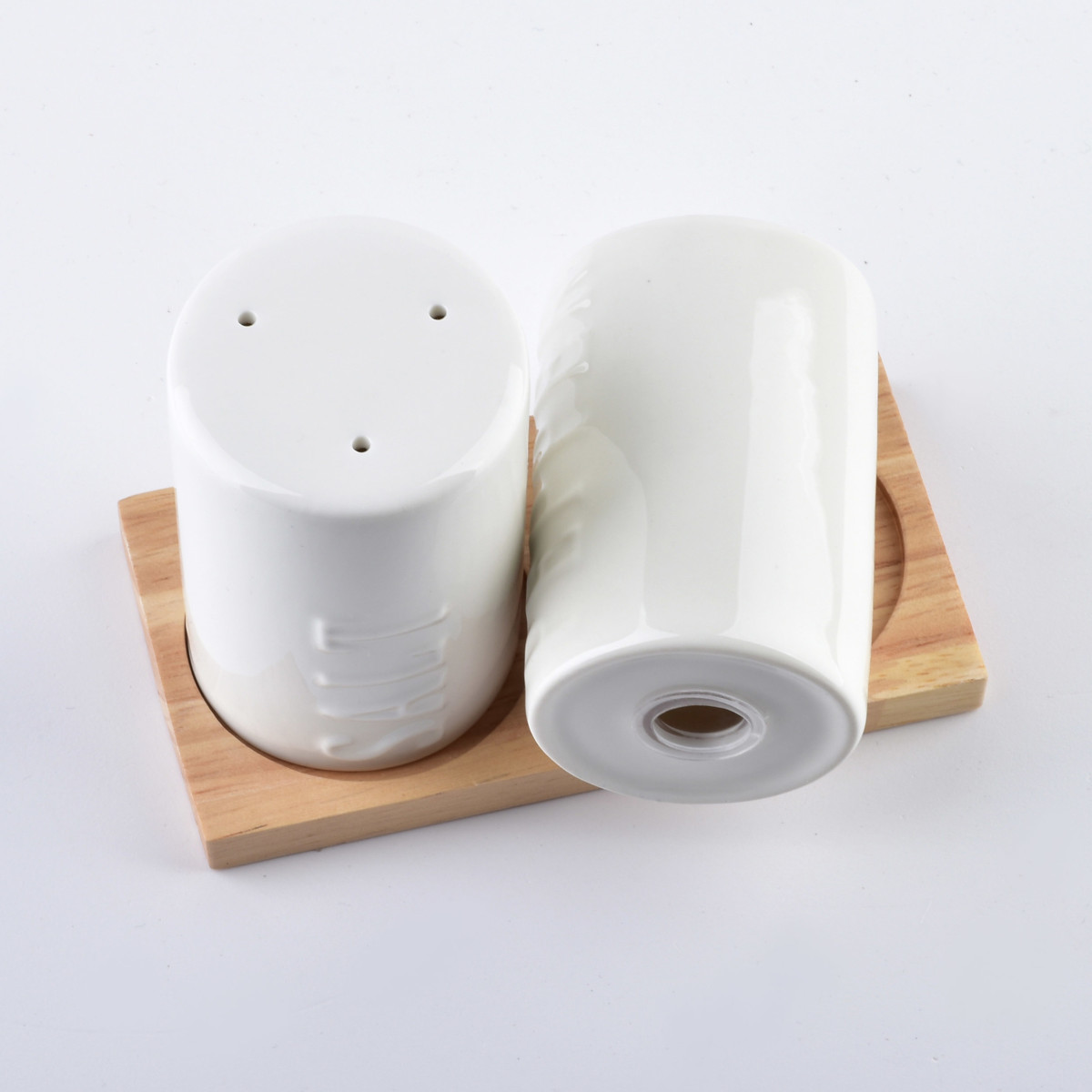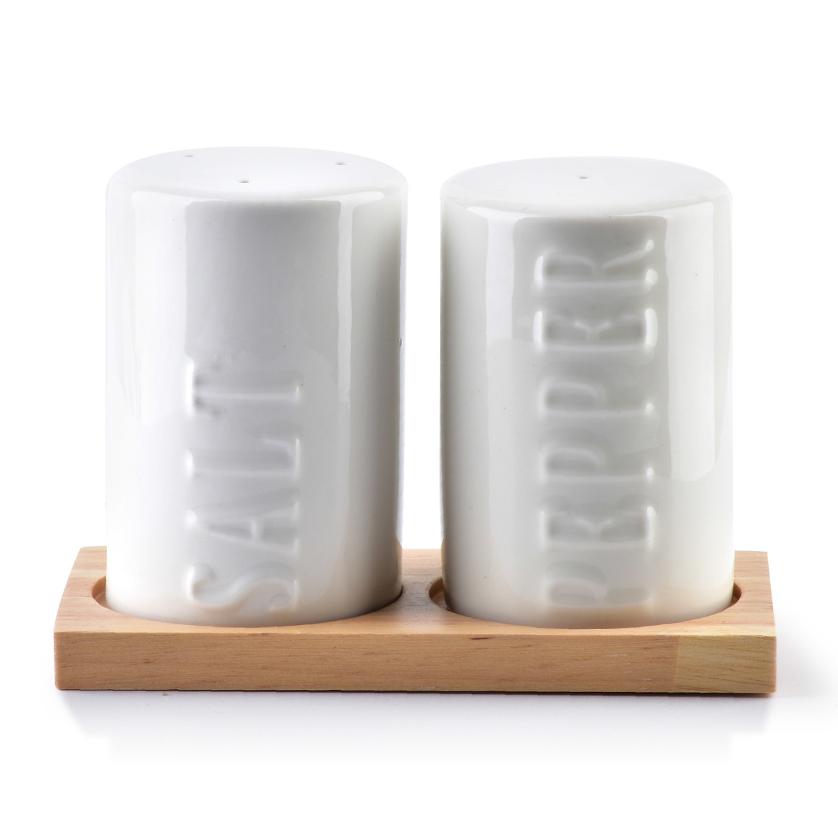 Komplet porcelanowych przywrotników sól i pieprz . Komplet posiada wytłoczone napisy w języku angielskim oraz bambusową podstawkę. Nowoczesny i uniwersalny – pasuje do każdej kuchni i jadalni.